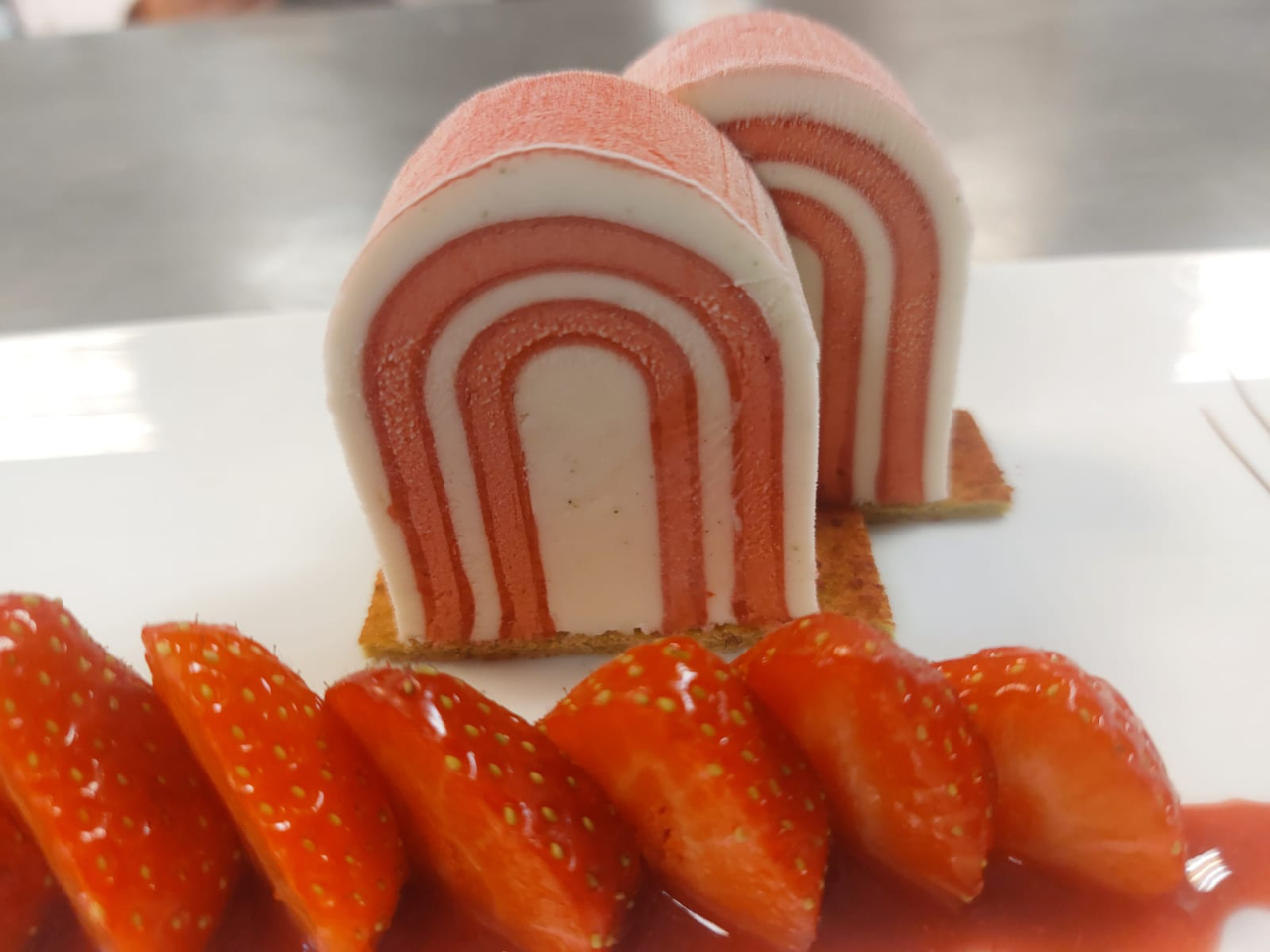Dessert in hoefijzervorm van aardbeien, yoghurt en dragon