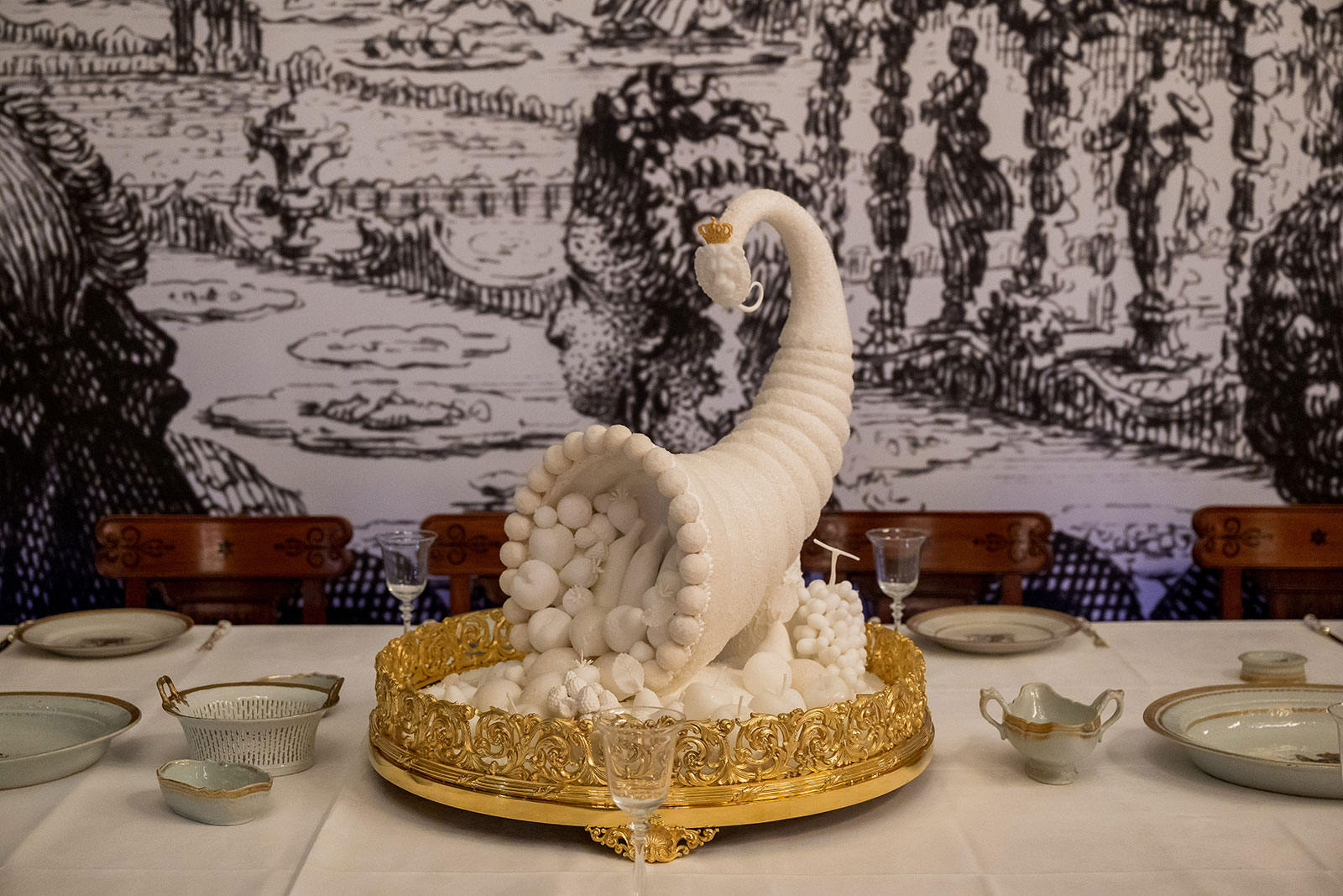 Especially for the exhibition "De Prins en de Stad" (The Prince and the City) Jeroen Goossens made three imposing sugar confectioneries inspired by the predecessors of Jeroen in the year 1768.